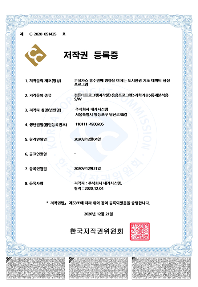 12월. 프로그램 등록. 제C-2020-051435호. 온실가스 흡수원에 영향을 미치는 도시환경 기초데이터 생성 프로그램